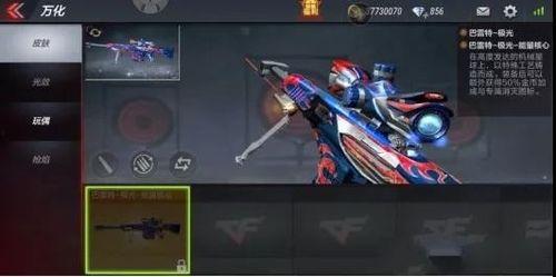 首先,咱们得聊聊这款新巴雷特的皮肤。据可靠消息,这款新皮肤采用了全新的设计理念,整体风格偏向未来科技,给人一种强烈的视觉冲击。皮肤的颜色以银白色为主,点缀着一些蓝色和紫色的线条,看起来酷炫十足。而且,这款皮肤还加入了动态效果,当你在游戏中使用巴雷特时,皮肤上的线条会随着枪口的火光闪烁,简直让人眼前一亮。